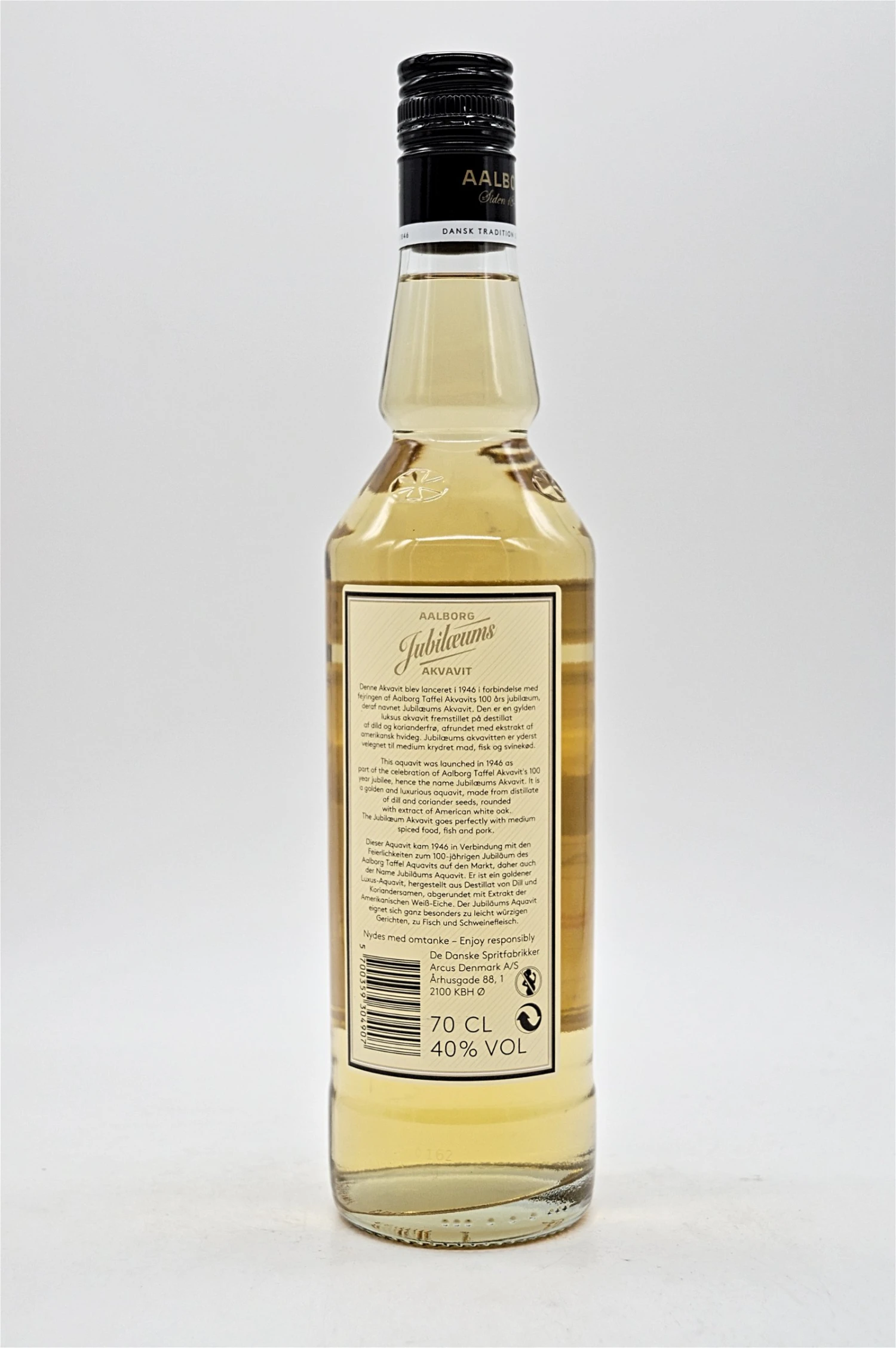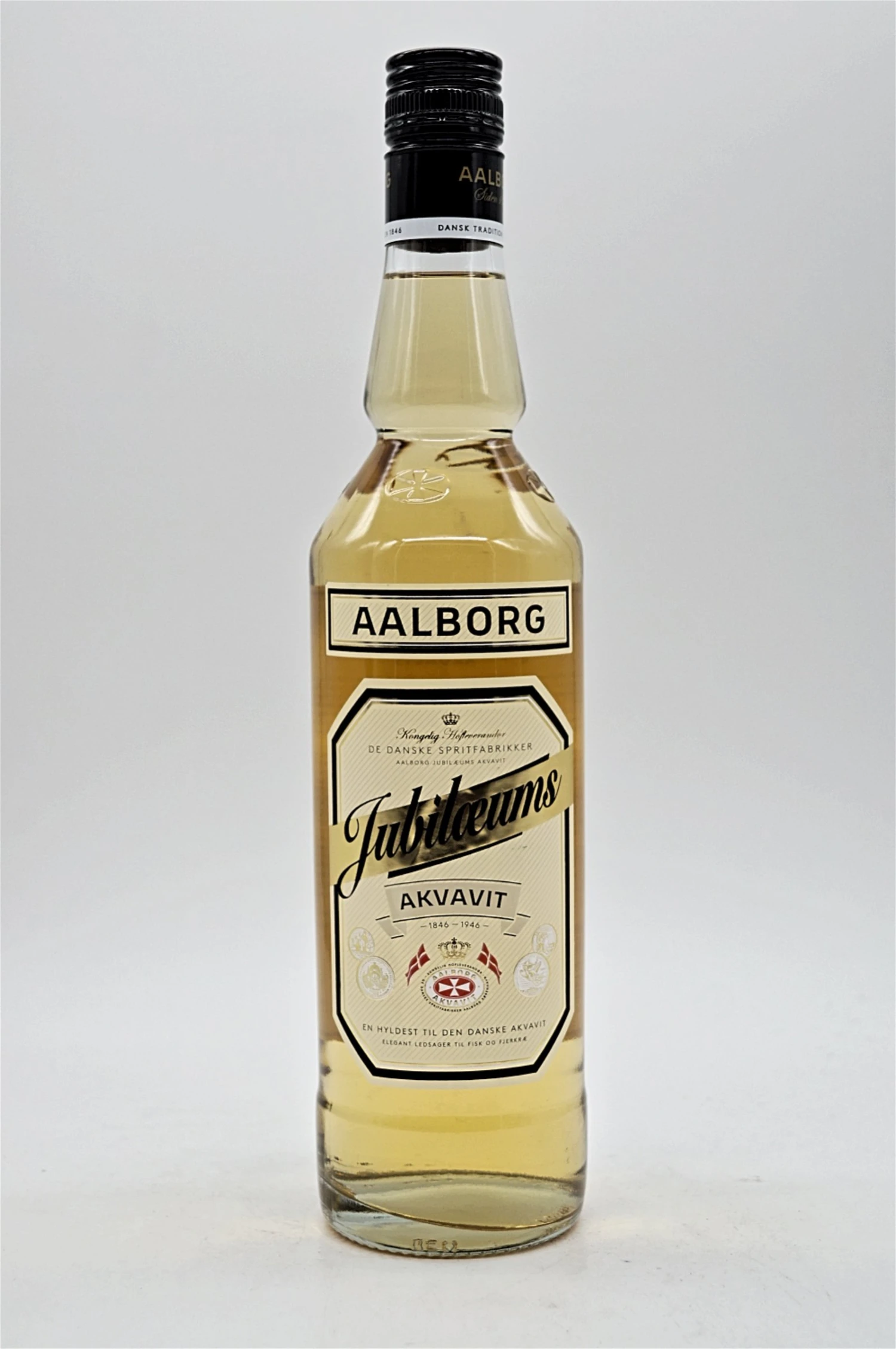 Dieser Aquavit kam 1946 zu den Feierlichkeiten zum 100-jährigen Jubliäum des Aalborg Taffel Akvavits auf den Markt, daher auch der Name Jubilaeums Akvavit. Er ist ein goldener Luxus-Aquavit, hergestellt aus Destillaten von Dill- und Koriandersamen, abgerundet mit Extrakten der Amerikanischen Weißeiche. Der Aalborg Jubilaeums Akvavit eignet sich ganz besonders zu leicht würzigen Gerichten, zu Fisch und Schweinefleisch.
