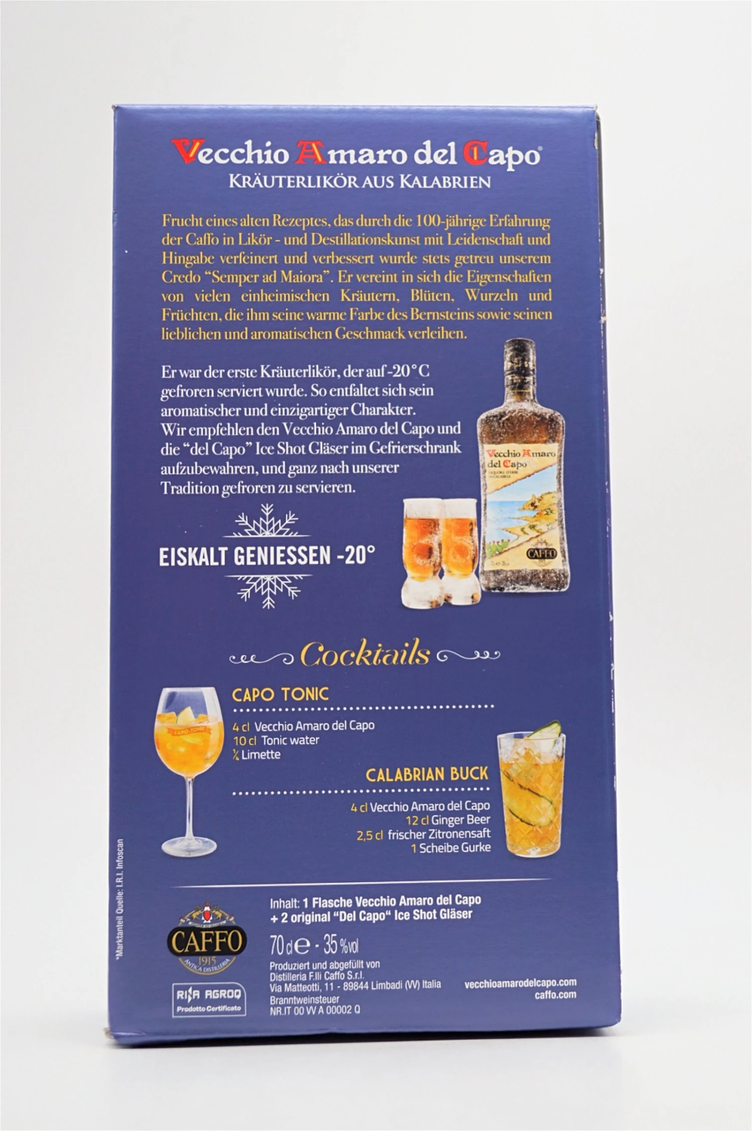 Ein symbolisches Produkt von Distilleria Caffo ist Vecchio Amaro del Capo, ein Likör auf Kräuterbasis aus Kalabrien, der die Früchte eines alten kalabresischen Rezepts enthält, das mit der Erfahrung aus vier Generationen der Caffo-Familie weiterverarbeitet und verbessert wurde. Der Vecchio Amaro del Capo Likör enthält die Wirkstoffe vieler wohltuender Kräuter, Blumen, Früchte und Wurzeln aus dem großzügigen Land Kalabriens, die mit feinstem Alkohol angereichert sind, um die Verdauung zu unterstützen und ein Gefühl des Wohlbefindens zu vermitteln. Unter den 29 Heilkräutern, aus denen die Aufgüsse bestehen, sind einige der in Kalabrien aufgrund ihrer tonisch-verdauungsfördernden Eigenschaften wie Bitterorange, Süßorange, Süßholz, Mandarine, Kamille und Wacholder am weitesten verbreitet. Sein delikater und aromatischer Geschmack passt sich auch empfindlicheren Gaumen an, die nicht an „Bitter Drinks“ gewöhnt sind. Nach der besten kalabresischen Tradition sollten sie gefroren getrunken werden (bei –20 ° C in kleinen, charakteristischen „Capo“ -Gläsern). Vecchio Amaro del Capo gehört heute zu den am weitesten verbreiteten in Italien und ist das erste Bittergetränk, das in den Slogans eingefroren wurde, die das Unternehmen bereits im Jahr 2000 auf den Markt gebracht hat in den siebziger Jahren, als der Verzehr hauptsächlich im Sommer stattfand und nur in Kalabrien vertrieben wurde, war Vecchio Amaro del Capo 2010 das einzige italienische Bittergetränk, das bei einem weltweiten Wettbewerb in Brüssel die Goldmedaille erhielt.