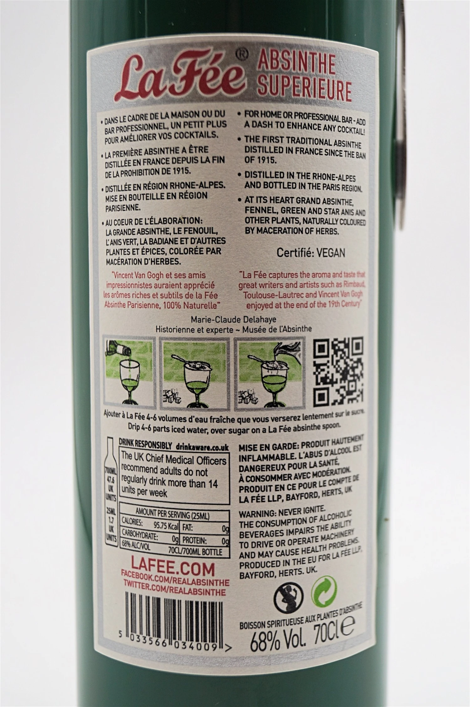 Dieser Absinth ist aus rein natürliche Zutaten und Farbstoffen (mazerierte Kräuter), destilliert in Frankreich. Zentraler Inhaltsstoff ist Grand Absinth (Artemisia absinthium) mit einer klassischen Stärke von 68% vol. La Fée wird aus drei Artemisia-Pflanzen im Herzen destilliert: Grand (Artemisia absinthium) & Petit Absinth (Artemisia pontica) und Genepi (Genepi Artemisia), Grüner und Sternanis, Fenchel, Ysop und Koriander.