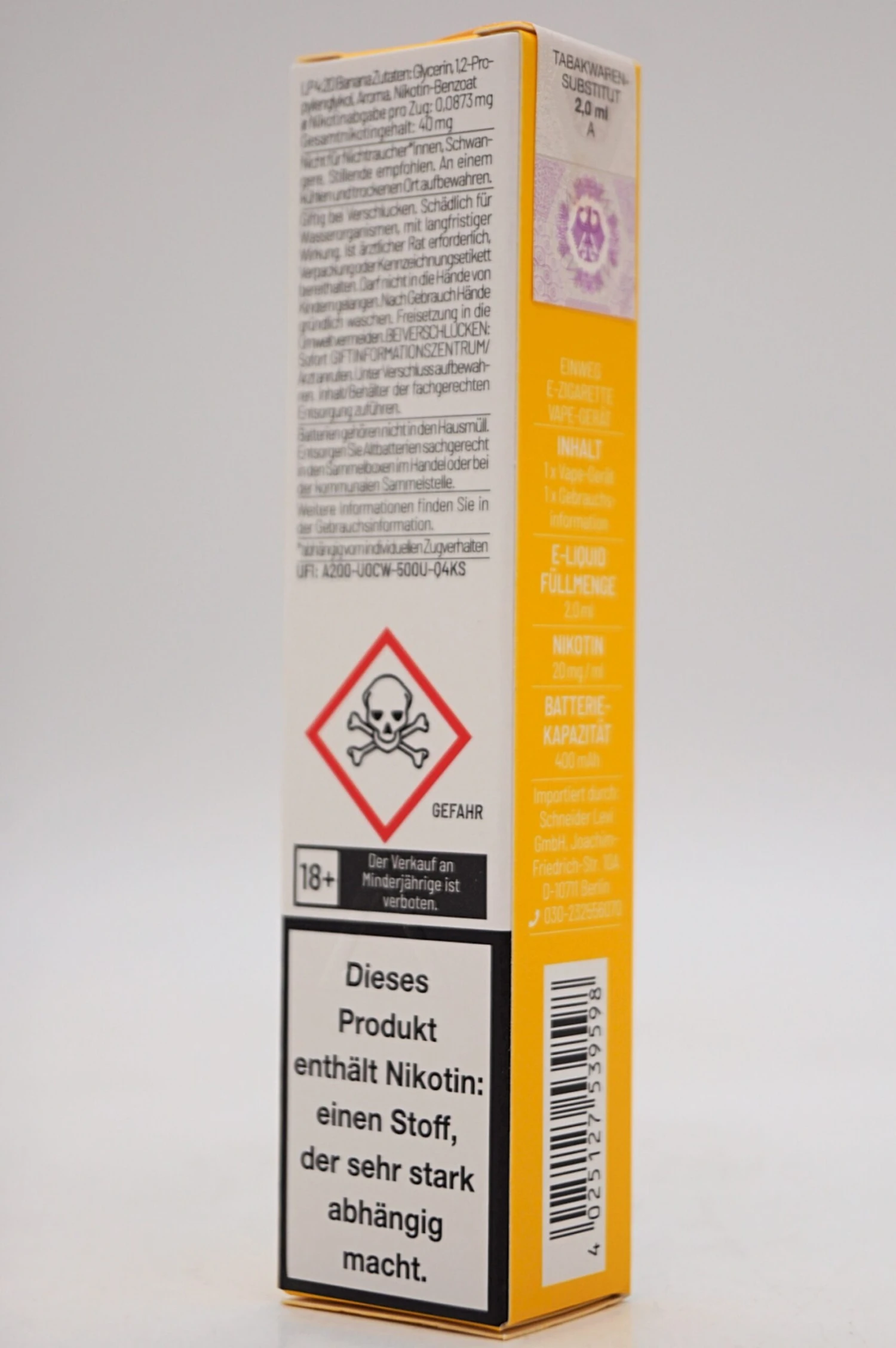 Nikotingehalt: 20 mg/ml Gesamtnikotingehalt: 40 mg (entspricht 20 mg/ml)