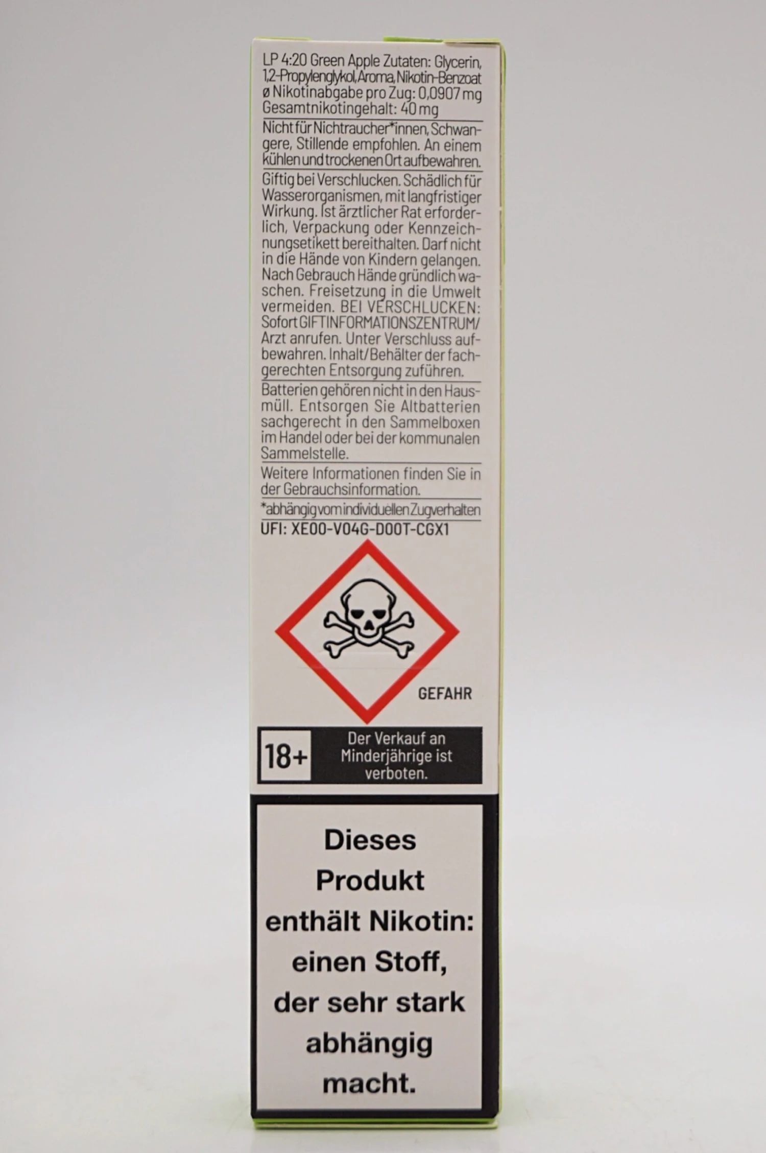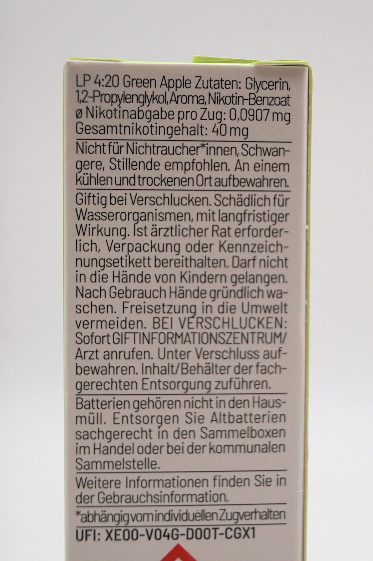 Nikotingehalt: 20 mg/ml Gesamtnikotingehalt: 40 mg (entspricht 20 mg/ml)