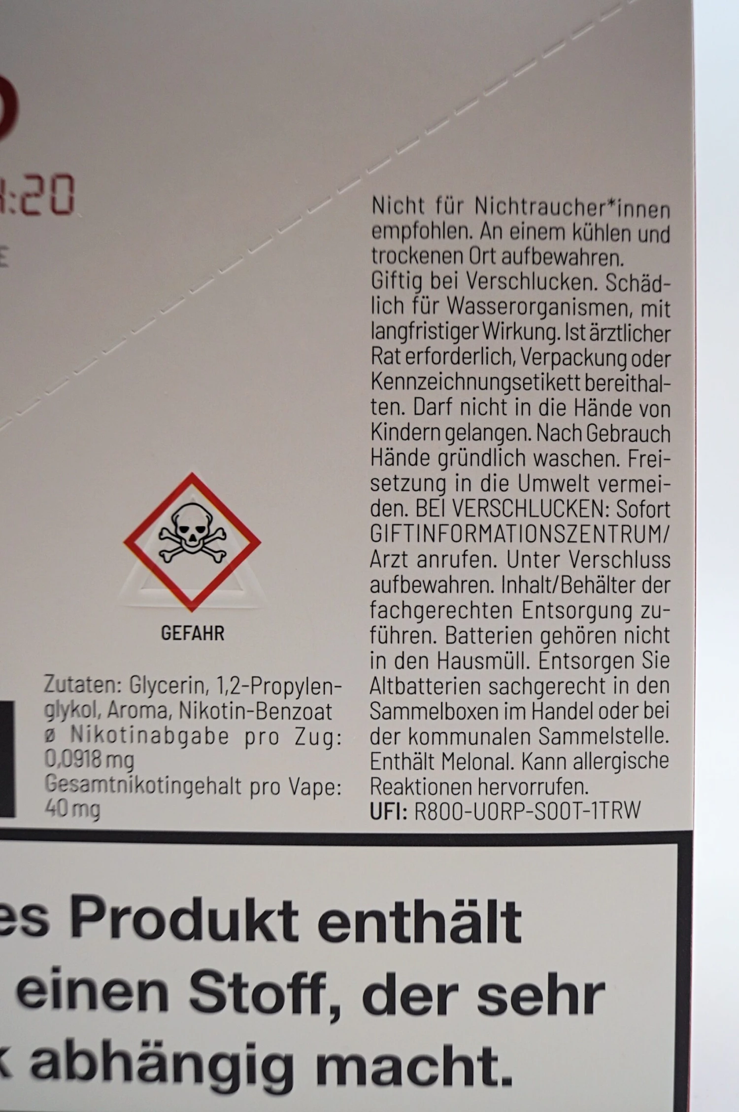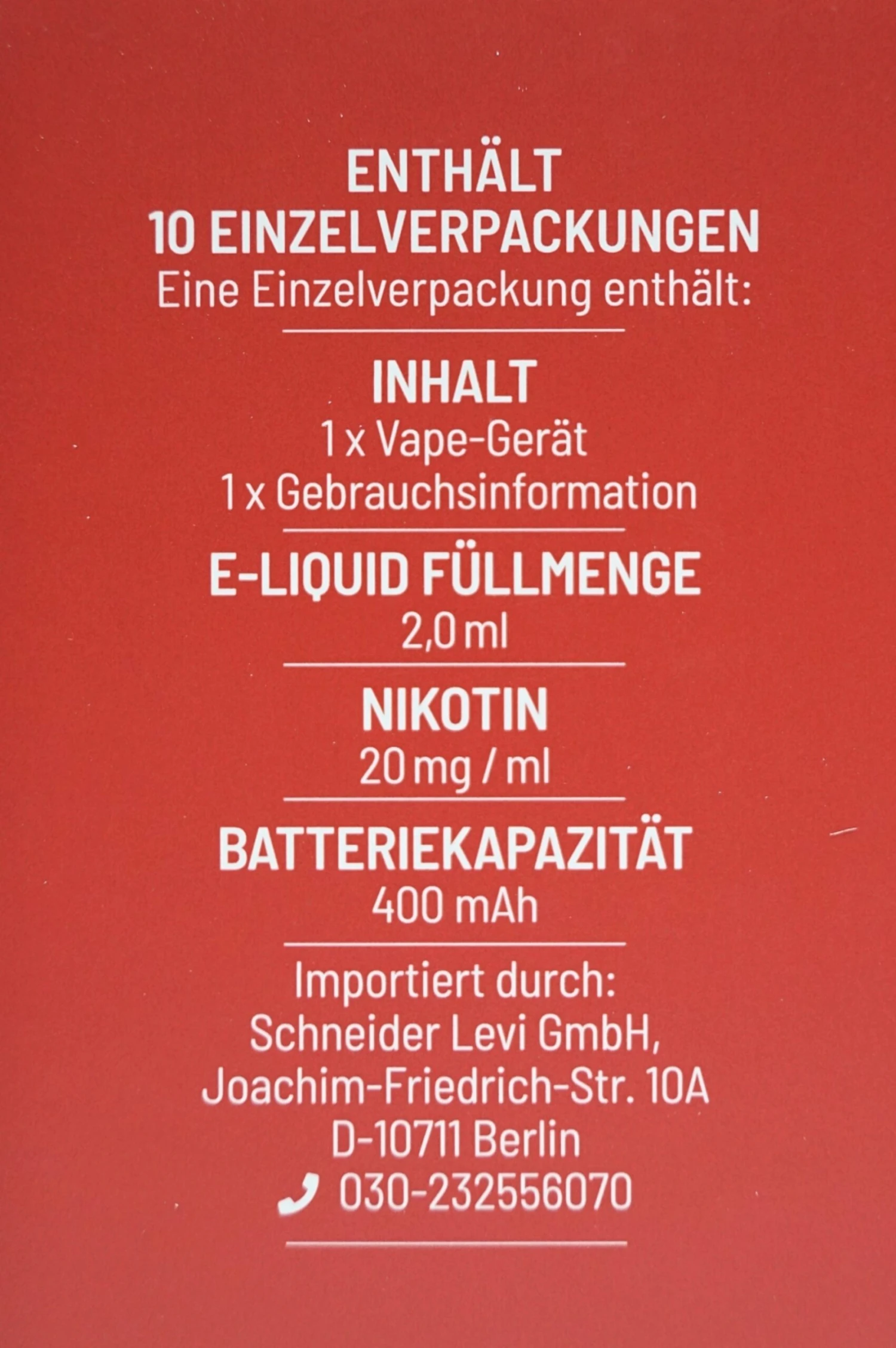 Nikotingehalt: 20 mg/ml Gesamtnikotingehalt: 40 mg (entspricht 20 mg/ml)