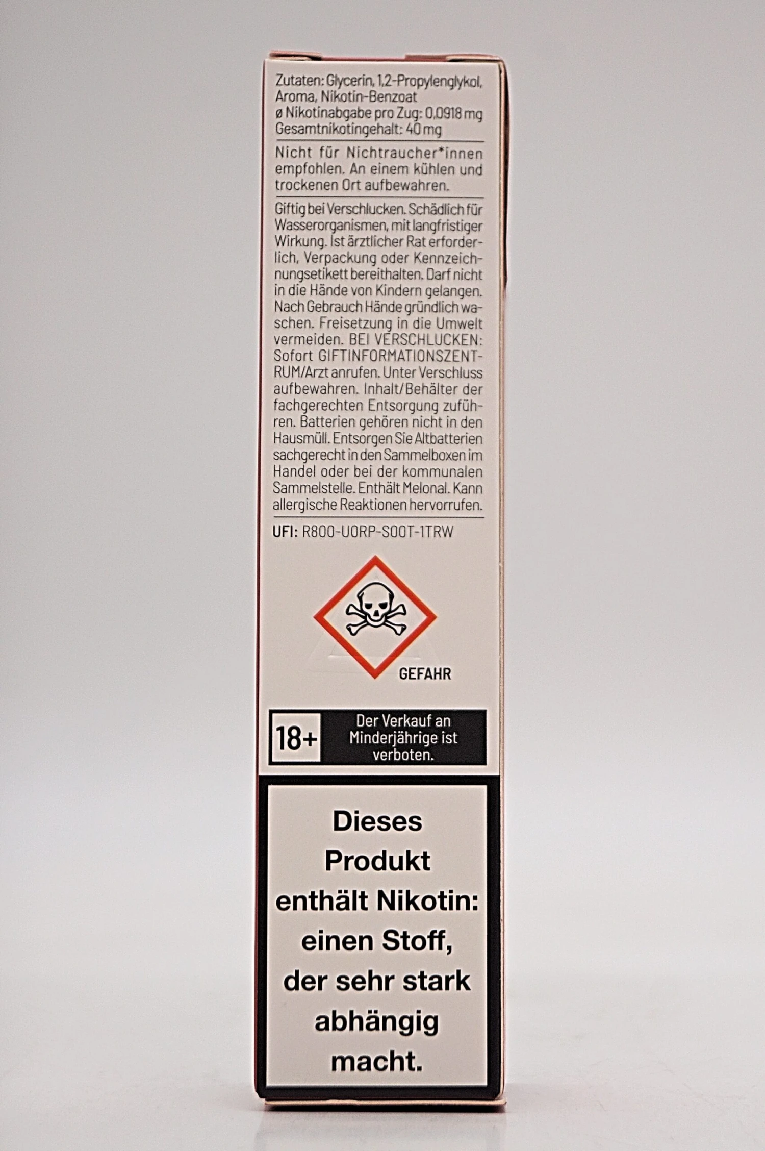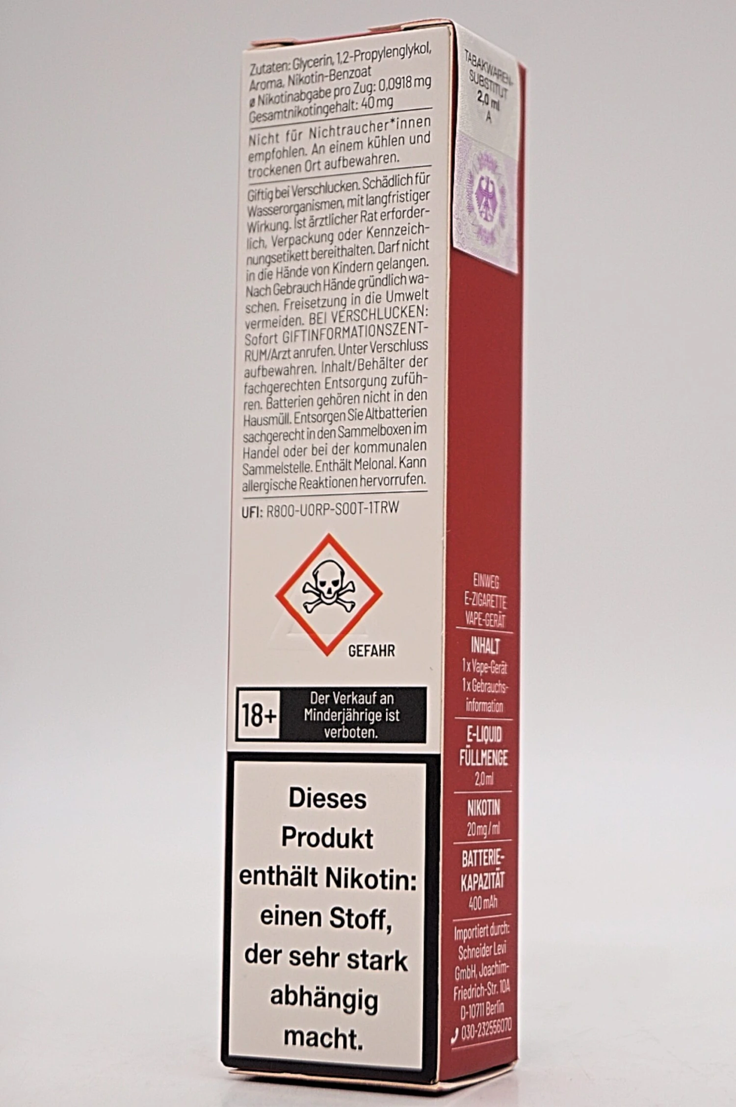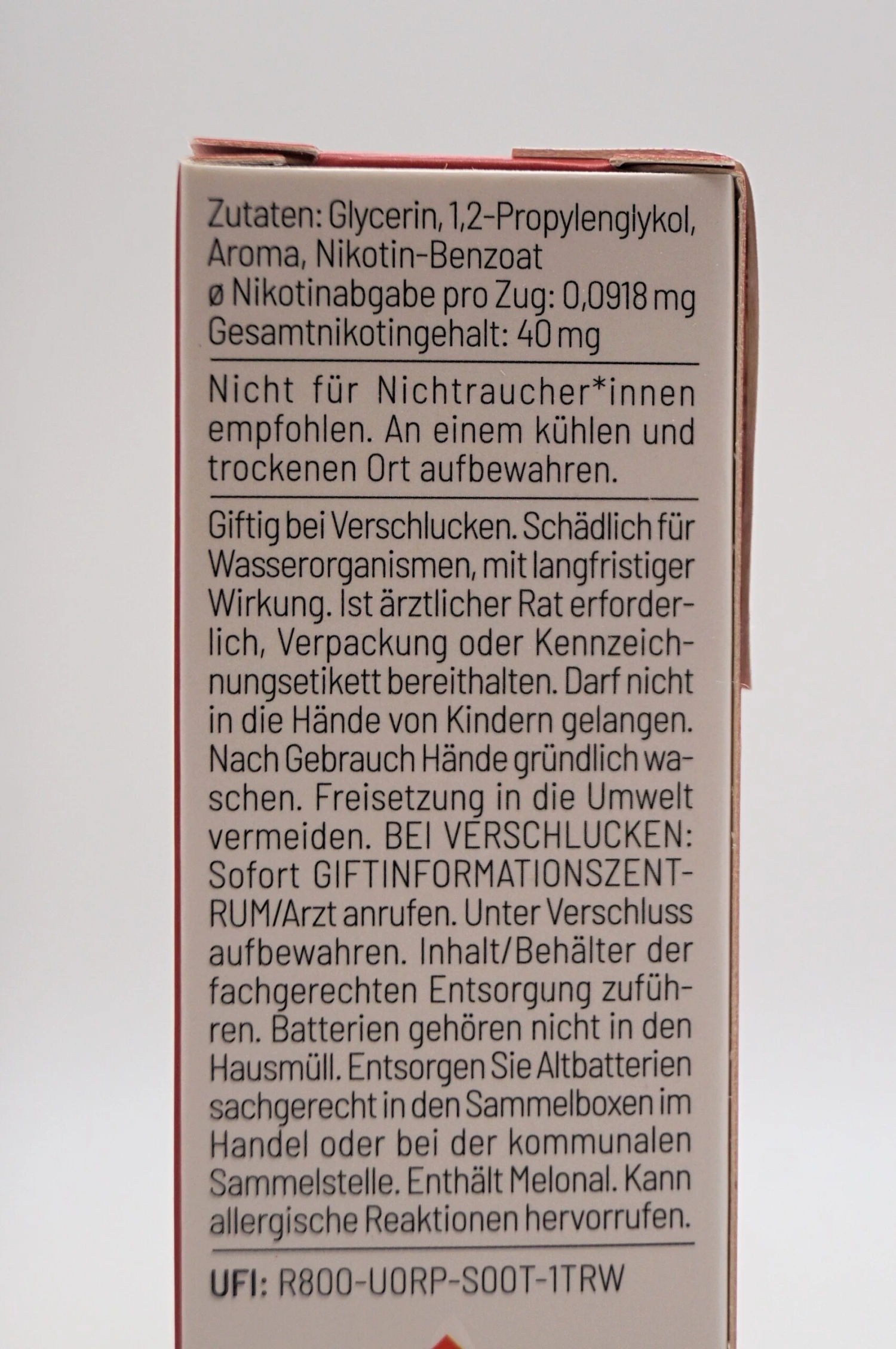 Nikotingehalt: 20 mg/ml Gesamtnikotingehalt: 40 mg (entspricht 20 mg/ml)