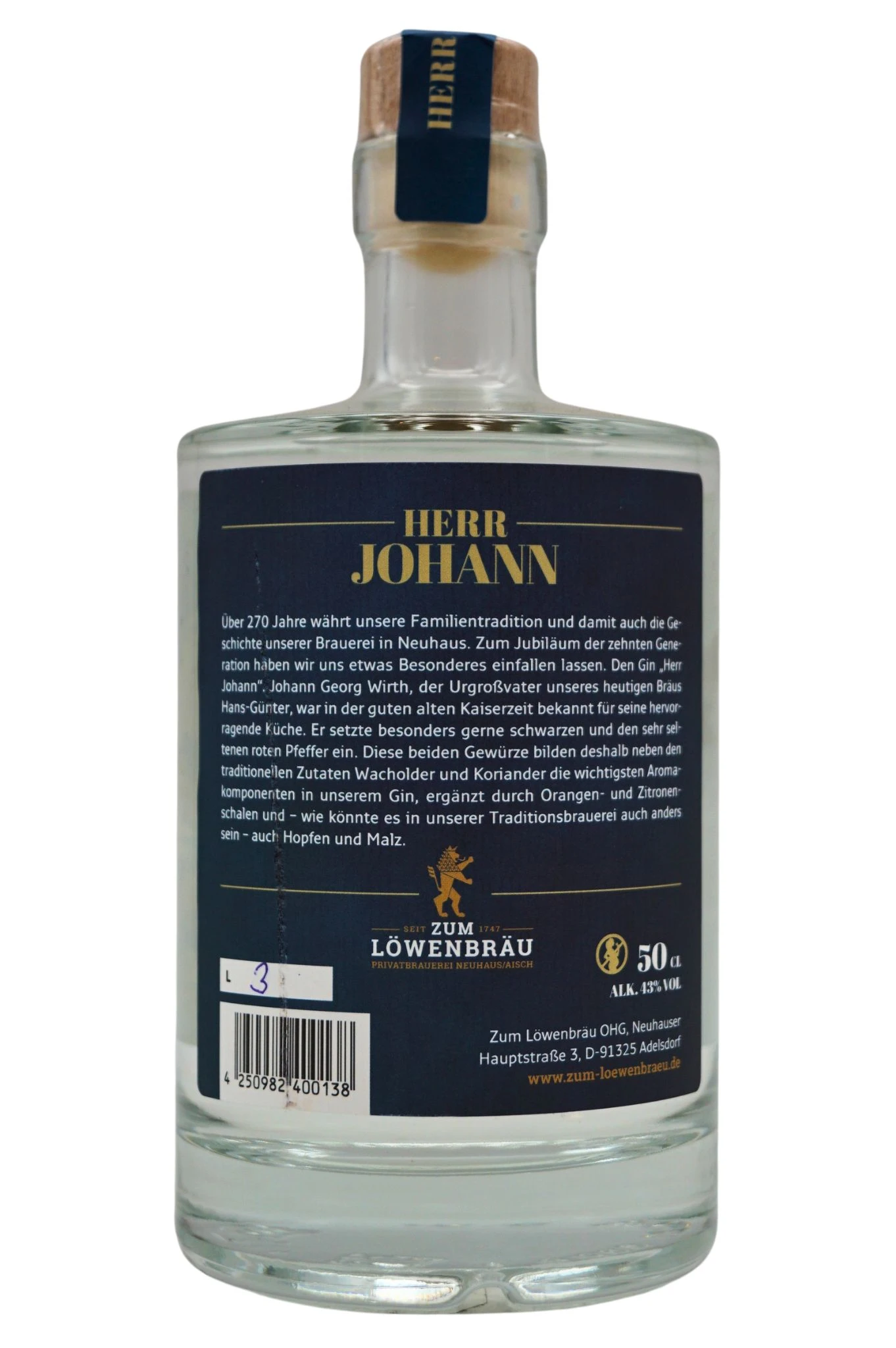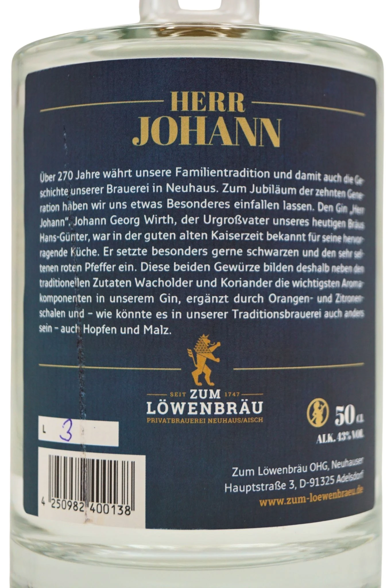 Hergestellt im Herzen Frankens, vereint der Herr Johann Gin Tradition und moderne Destillationskunst. Jede Flasche wird in kleinen Chargen gefertigt, um höchste Qualität und Frische zu gewährleisten. Die Brauerei Löwenbräu legt besonderen Wert auf Handarbeit und verwendet nur die besten Zutaten, um einen Gin zu schaffen, der unverwechselbar und einzigartig ist.